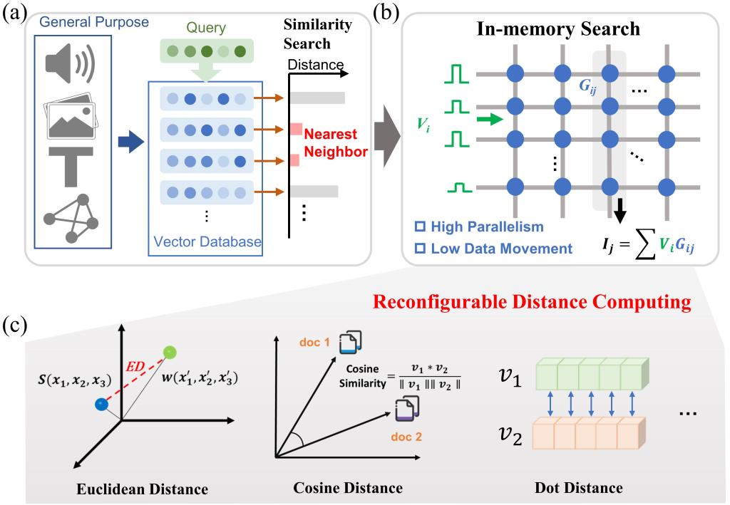 随着大语言模型(LLM)与检索增强生成(RAG)技术的爆发,通用向量数据库(Vector Database)已成为人工智能的核心。然而,如何在海量的高维向量数据中,快速、低功耗地找到“最近邻(Nearest Neighbor)”,已成为制约系统响应速度的核心痛点。传统的冯·诺依曼架构面临严峻的“存储墙”瓶颈,数据搬运消耗了大量能效。而现有的存算一体方案虽然能加速矩阵乘法,却面临一个“通用性难题”:大多数存算硬件仅支持简单的点积(Dot Product)运算,难以高效支持工业界广泛应用的欧式距离(L2)和余弦相似度(Cosine)——后两者涉及平方、开方及除法等复杂非线性运算,通常需要昂贵的数字电路辅助,严重削弱了存算一体的能效优势。