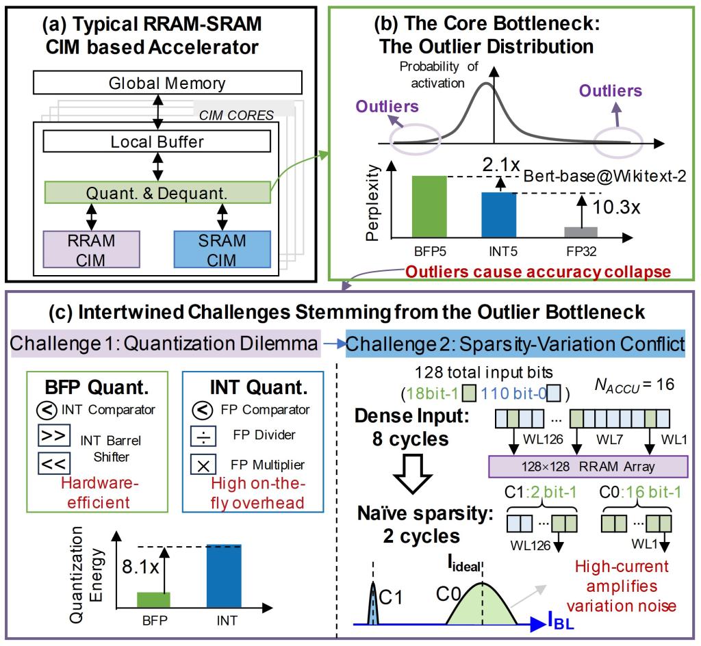 图2 (a)典型RRAM-SRAM存算加速器;(b)异常值是Transformer量化的核心瓶颈;(c)量化困境和稀疏-噪声矛盾。