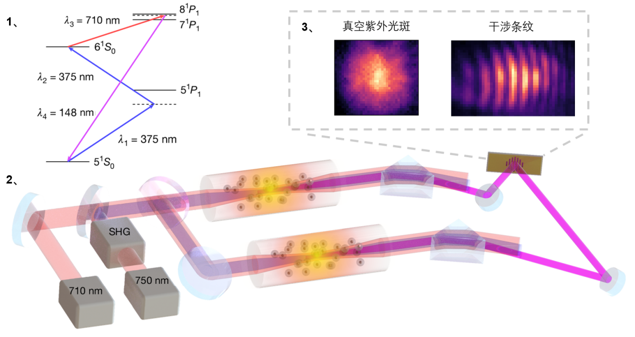 图1:镉原子共振增强四波混频过程;图2:实验示意图;图3:相机拍摄到的真空紫外光斑和干涉条纹