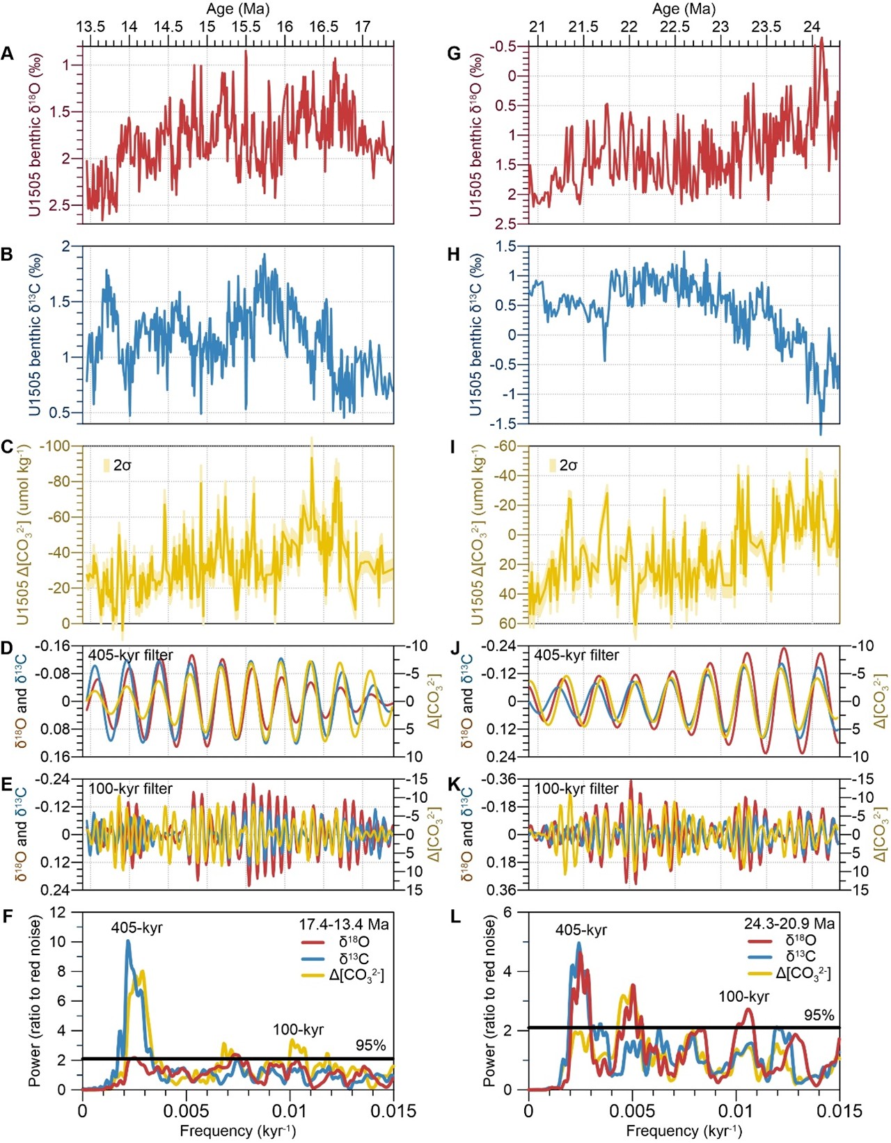 图2. U1505站位重建的海水∆[CO32-]具有显著的偏心率周期,并与δ18O和δ13C同相位变化。(A和G)底栖有孔虫δ18O,(B和H)δ13C,(C和I)∆[CO32-]记录。(D, E, J和K)δ18O、δ13C和∆[CO32-]的40万年和10万年周期滤波结果。(F和L)δ18O、δ13C和∆[CO32-]的谱功率。