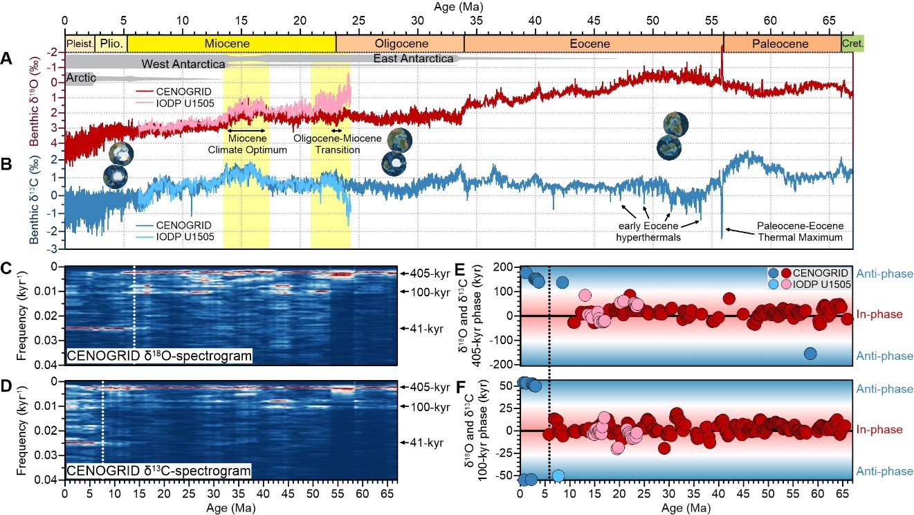 图1. 新生代~66–6 Ma双极冰盖形成之前的暖室期,底栖有孔虫δ18O和δ13C记录呈现显著的40万年和10万年偏心率周期,并且δ18O–δ13C在偏心率时间尺度上呈现同相位变化,与~6 Ma之后的冰室期二者反相位变化形成鲜明对比。(A和B)底栖有孔虫δ18O和δ13C记录,深色曲线为新生代全球同位素CENOGRID曲线,浅色曲线为IODP U1505站位数据,灰色条带示两极冰盖的演化历史,黄色阴影示该研究聚焦的时间段。(C和D)CENOGRID δ18O和δ13C曲线的演化谱分析结果。(E和F)底栖有孔虫δ18O和δ13C在40万年和10万年偏心率周期上的相位演化关系。