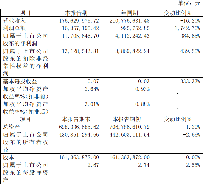利润方面,公司利润总额为-1635.72万元,同比下降1742.7%;归属于上市公司股东的净利润为-1170.56万元,同比下降384.65%;归属于上市公司股东的扣除非经常性损益的净利润为-1312.85万元,同比下降439.25%;基本每股收益为-0.07元,同比下降333.33%。