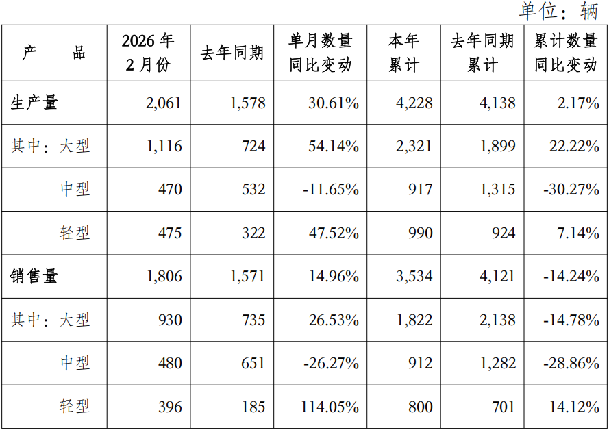 3月4日,宇通客车发布2026年2月份产销数据快报。数据显示,公司2月生产量为2061辆,同比增长30.61%;销售量为1806辆,同比增长14.96%。累计方面,2026年1-2月公司累计生产4228辆,同比增长2.17%;累计销售3534辆,同比下降14.24%。