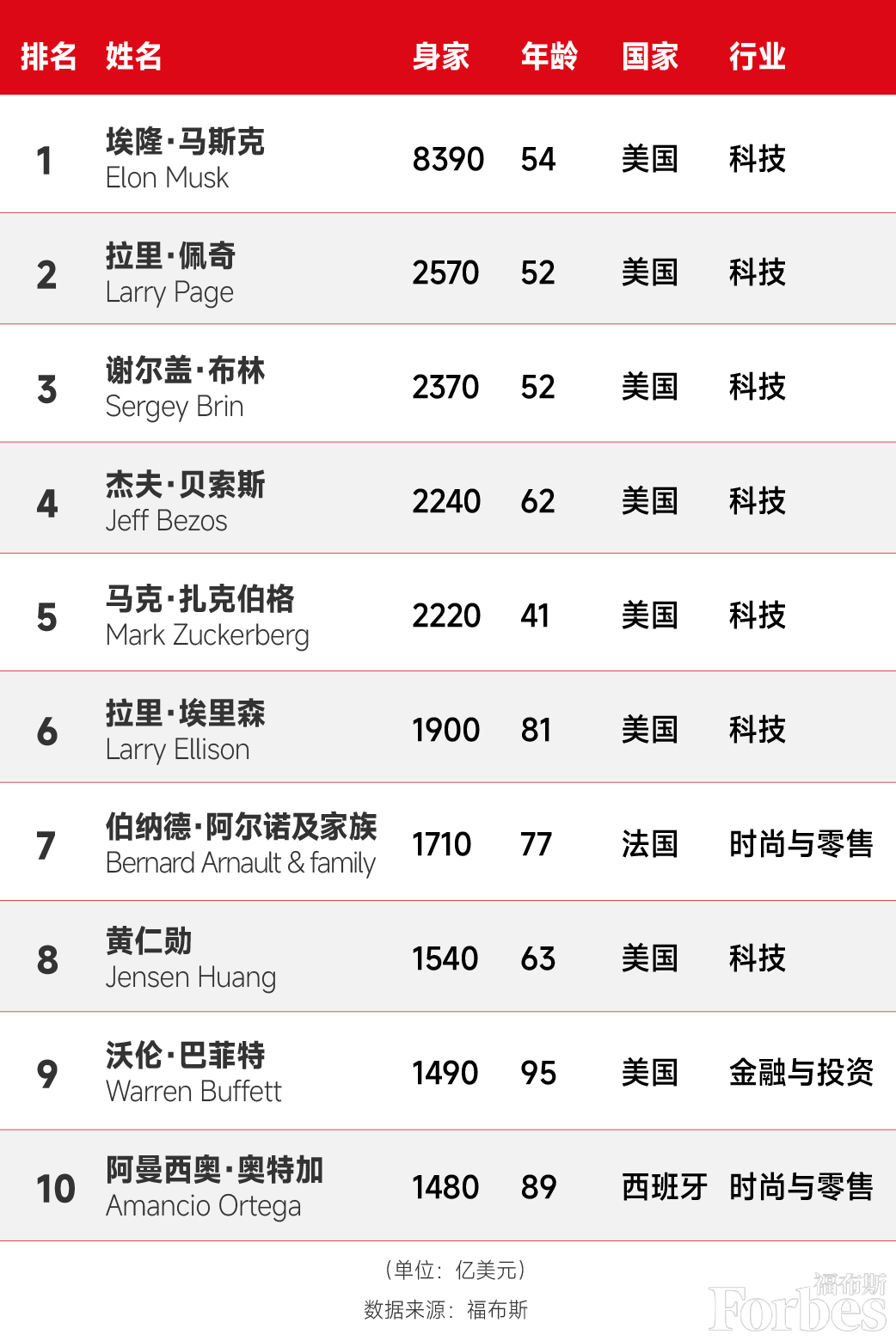 福布斯发布全球亿万富豪榜:马斯克蝉联全球榜首,张一鸣蝉联中国大陆首富