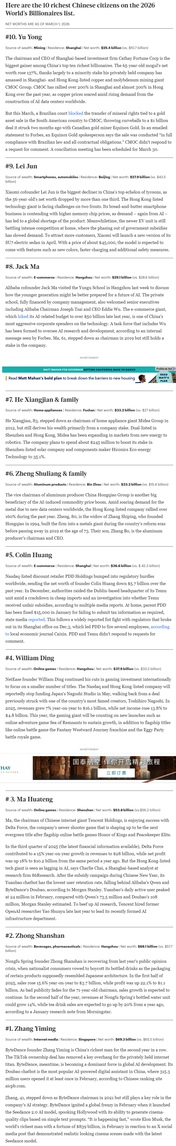 字节跳动创始人张一鸣以693亿美元的净资产继续保持中国大陆首富的地位。农夫山泉董事长钟睒睒以681亿美元的财富紧随其后,位居第二。腾讯董事长马化腾以538亿美元的净资产位列第三。这位科技巨头正加紧与同行展开竞争,力图吸引用户使用各自的人工智能助手。