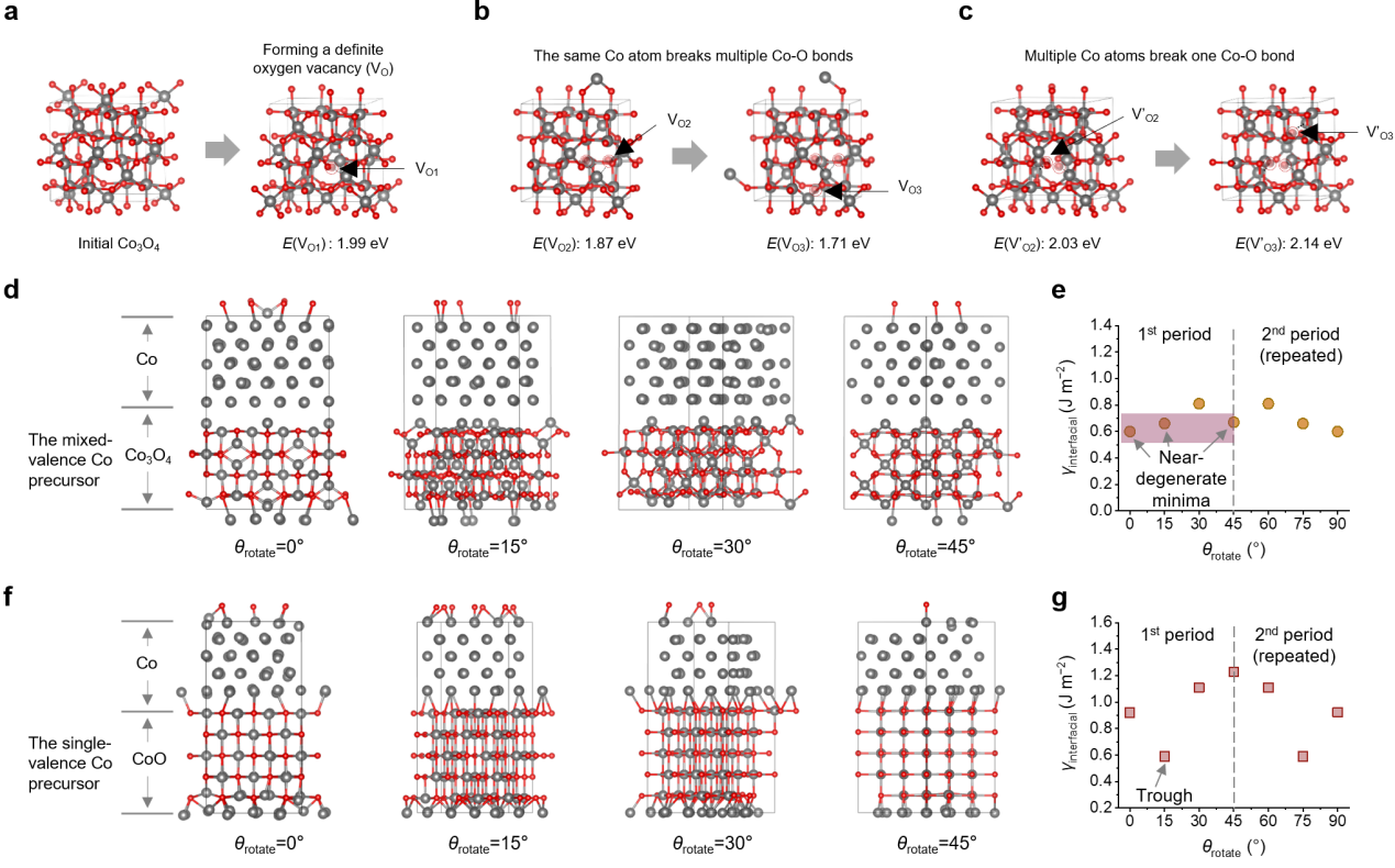 研究结合DFT理论计算进一步阐明合成机理。固相还原和成核过程大致遵循以下步骤:高价金属的还原和氧空位的形成,空位扩散或零价金属的迁移和聚集,以及晶体核的形成。在兼具四面体配位的Co2+和八面体配位的Co3+的Co3O4中,Co2+将优先断开所有的Co–O键,局部氧空位积累,从而促进局部金属化和迁移。这为多晶混合价前驱体中的空间非均匀成核提供了机制基础。接着,计算还原的Co0晶核与未还原的氧化物前驱体之间的界面形成能γ,分析其对晶体生长周期性的影响机制。对于混合价态的前驱体,γ在界面旋转角度为 0°、15°和 45°时呈现出几个近乎重叠的最小值,这表明其取向锚定作用较弱,从而倾向于形成多晶。而对于单一价态的前驱体,γ在界面旋转角度为15°时呈现出单一的最小值,这表明其锚定作用较强,更有利于形成单晶。