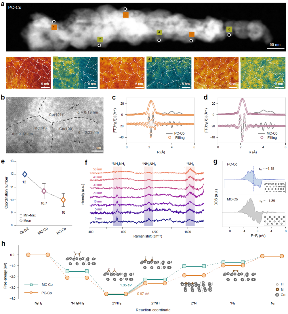 此外,研究以PC-Co和MC-Co催化剂作为范例用于肼氧化反应(HzOR),阐明了晶体周期性与催化活性之间的关系。实验与计算综合表明,PC-Co的配位数比MC-Co更小,从而使得d带中心上移,增强了中间体NH*的吸附,促进反应子步骤的吉布斯自由能垒的均匀化。结果,PC-Co催化剂表现出快速的催化动力学,其塔菲尔斜率低至14mV dec−1,并在100mA cm−2下表现出120小时的优异稳定性。为了进一步展示其应用潜力,研究团队组装了HzOR耦合的新型锌空气电池。得益于肼废水的化学能转化,该电池在10mA cm−2的电流密度下实现了高达193%的电能效率(传统锌空气电池仅为64%),并且稳定运行了1200小时。以回收废旧钴酸锂正极作为钴源合成的PC-Co催化剂,相较于商业钴源,成本降低了75.2%。