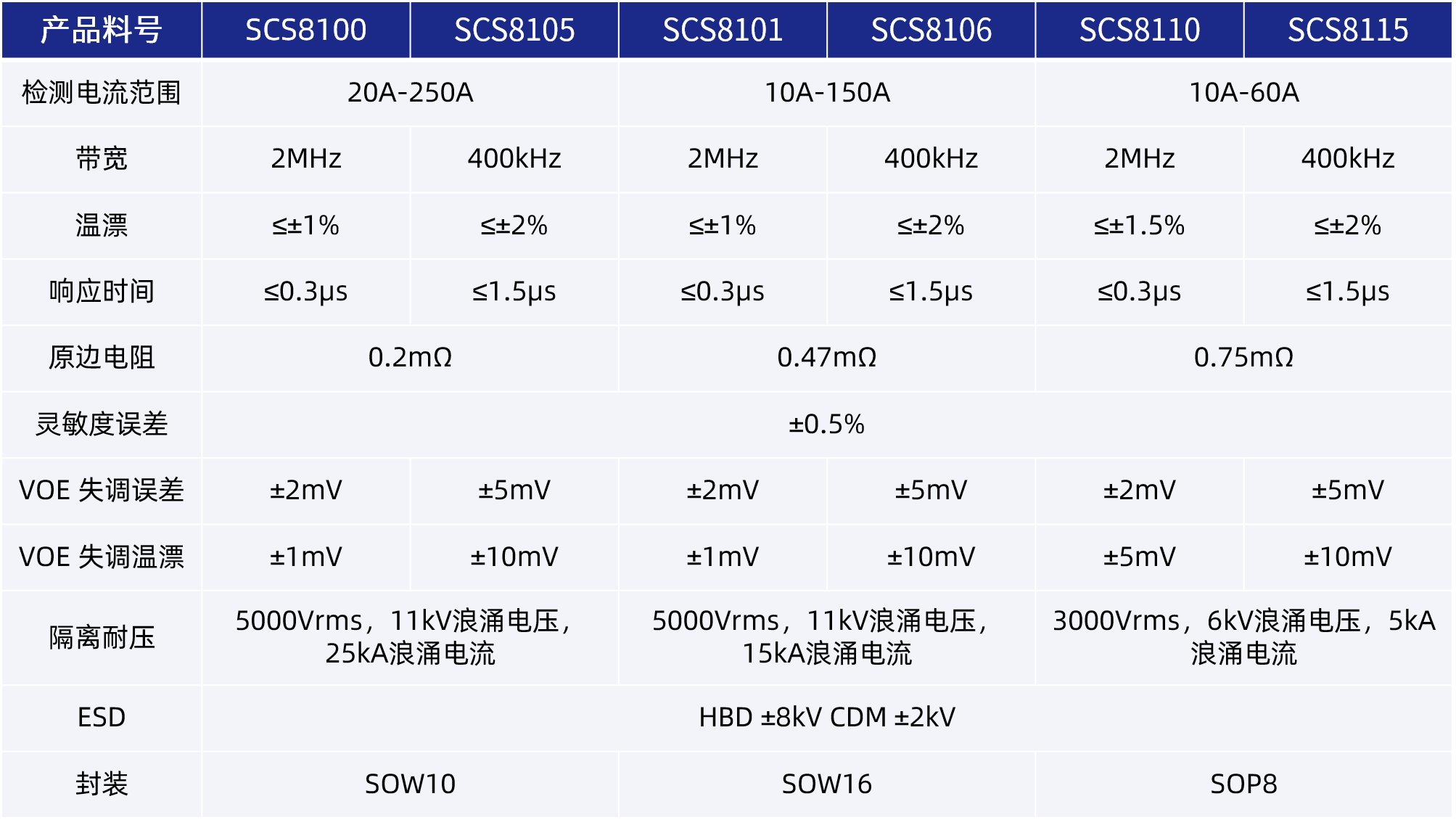 SCS81XX 提供高精度和低成本两个系列,提供 SOW10、SOW16、SOP8 三种封装,以及 20A-250A、10A-150A、10A-60A 三种电流检测范围选择,电流量程覆盖更广、档位划分更细,可灵活适配数字能源系统中不同功率等级的应用需求。各型号关键性能参数详见下表: