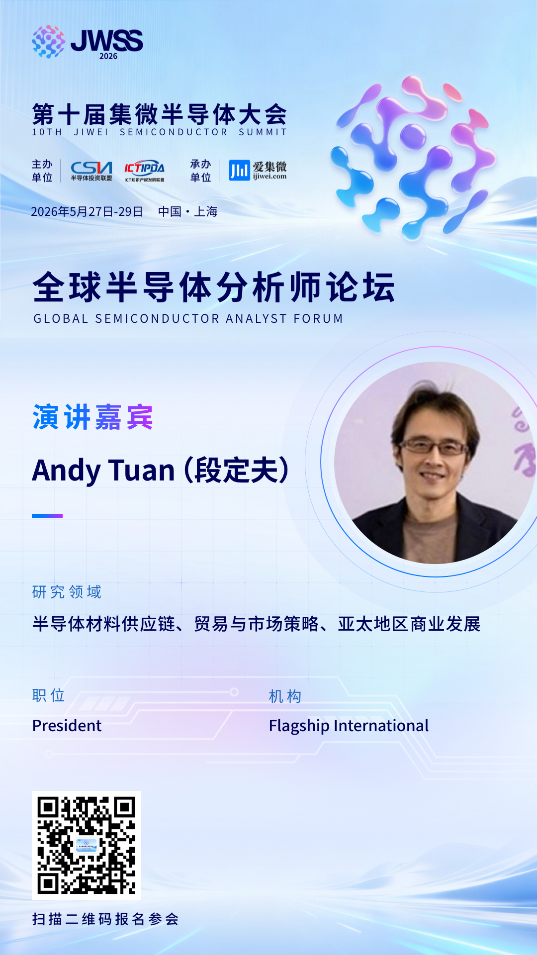 在本届大会上,Andy Tuan将围绕“半导体材料供应链发展趋势”这一主题展开分享,深入剖析当前全球半导体材料供需格局的演变逻辑,解读关键材料领域的技术突破与国产替代进程;研判在地缘变局与产业链区域化趋势下,材料环节的供应链韧性与协同发展方向。最后,他还将结合多年产业实践,前瞻性探讨半导体材料未来几年的技术演进路径与市场格局重塑的可能性。