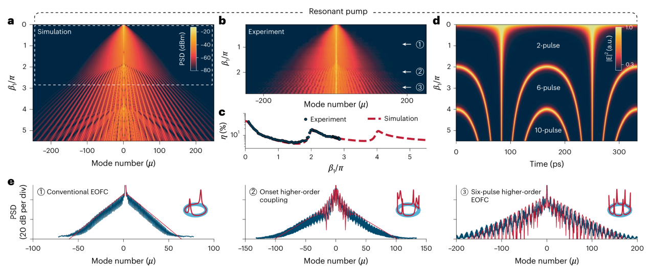 基于电光效应的频率梳是精密计量、光谱学、光子互连与量子计算中的重要光源。谐振型电光频率梳通过把微波调制引入光学微腔,从而在离散腔模之间建立可控耦合。这使得谐振型电光频率梳能够借助腔内场增强效应来高效地产生一系列等间距的新频率分量,进而具有结构紧凑、工作稳定、易于操控等优势。长期以来,人们对这类器件的理解主要建立在“最近邻耦合”图像之上:当微波频率与微腔自由光谱范围(FSR)匹配、调制较弱时,频谱输出通常表现为两侧近似指数衰减的频谱,在时域上对应双脉冲态。此次工作首次在实验上实现了强耦合电光频率梳的直接观测,并借助薄膜铌酸锂平台对调制深度和光学失谐进行了高自由度调控,揭示了谐振电光频率梳完整的非线性态空间。值得一提的是,团队此前也曾在国际上首次理论预测了强耦合电光频率梳的存在[Light Sci Appl 14,373(2025)]。