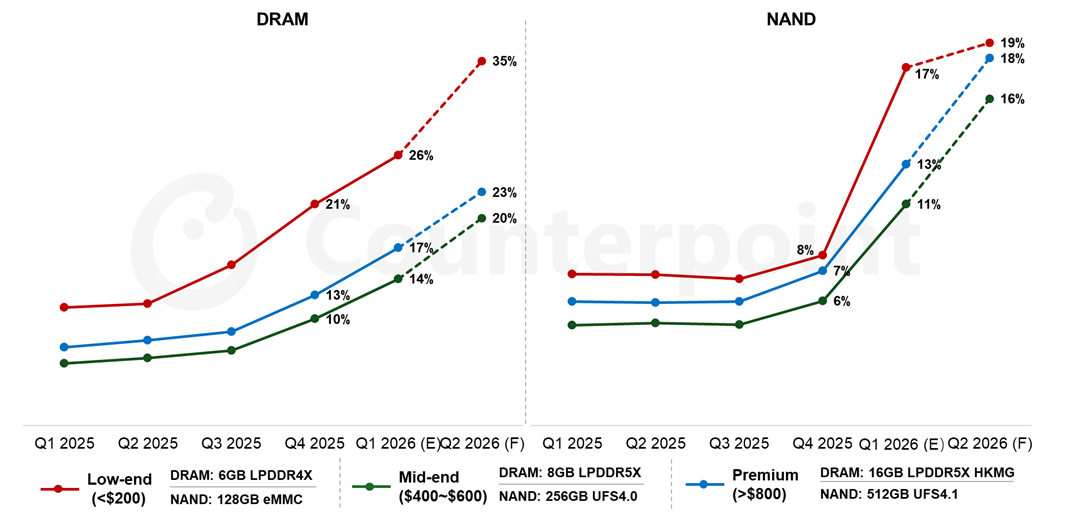 • 中端(批发价格400至600美元):这一细分市场通常会采用多样化的配置方案,以满足不同用户群体的需求。对于常用的 8GB LPDDR5X + 256GB UFS 4.0 存储配置,在 2026 年第一季度,DRAM和NAND的成本占比将分别上升至 14% 和 11%。预计到2026 年第二季度,这一比例将分别攀升至 20% 和 16%。