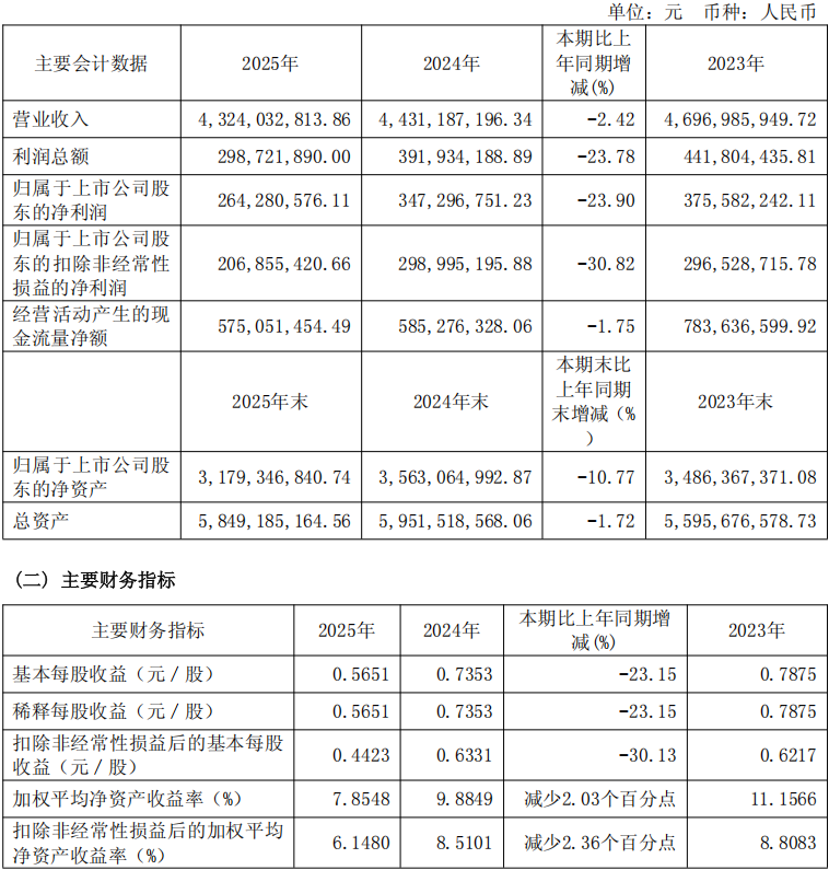 截至2025年末,公司总资产为58.49亿元,较上年末下降1.72%;归属于上市公司股东的净资产为31.79亿元,较上年末下降10.77%。资产负债率为44.60%,较上年末上升5.63个百分点。经营活动产生的现金流量净额为5.75亿元,同比下降1.75%。