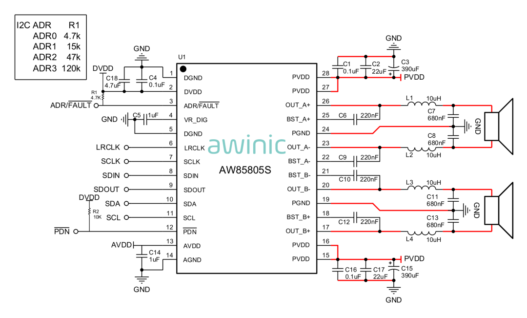 · BTL:2×30W@4Ω,18V,THD+N<1%