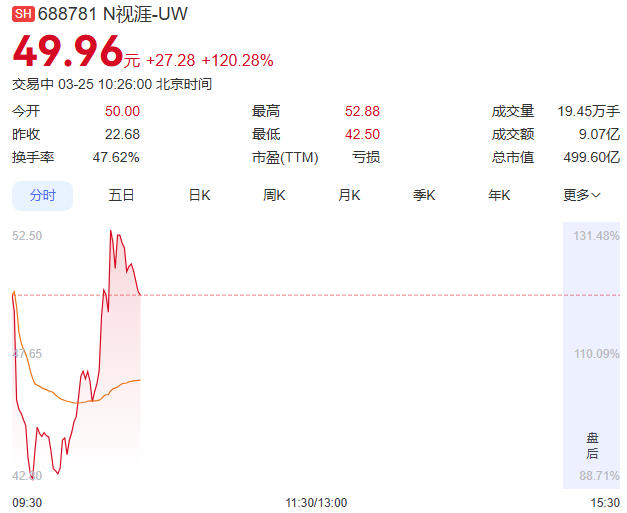 3月25日,视涯科技股份有限公司(股票简称:视涯科技,股票代码:688781)正式在上交所科创板上市。截至发稿,公司股价报49.96元/股,较22.68元/股的发行价上涨120.28%,总市值达到499.6亿元。