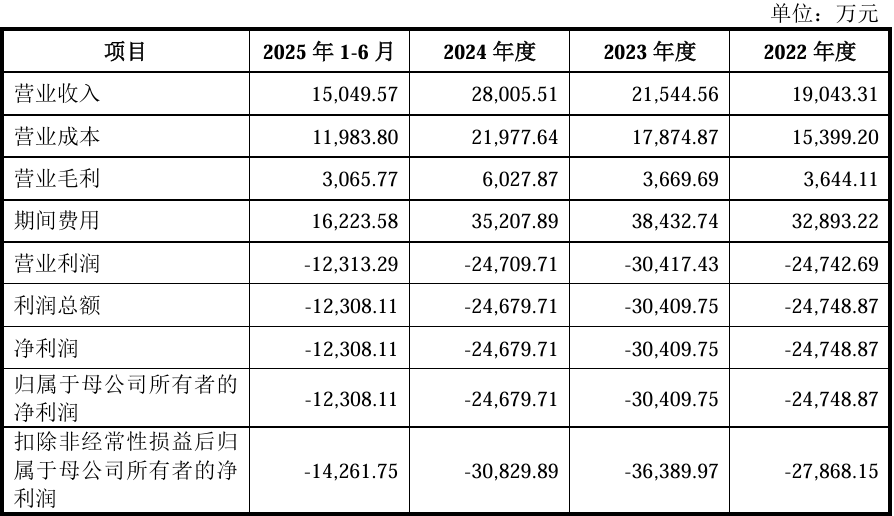 财务数据显示,报告期各期(2022年-2025年H1)公司营业收入分别为19,043.31万元、21,544.56万元、28,005.51万元和15,049.57万元,主营业务毛利率分别为19.12%、17.03%、21.52%和20.37%。报告期各期,公司研发费用分别为23,705.02万元、28,729.54万元、26,866.06万元和12,073.90万元,占营业收入的比例分别为124.48%、133.35%、95.93%和80.23%。报告期各期,公司归属于母公司普通股股东的净利润分别为-24,748.87万元、-30,409.75万元、-24,679.71万元和-12,308.11万元。